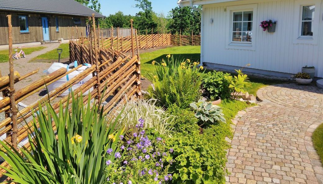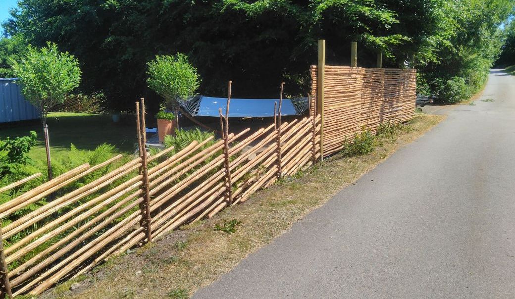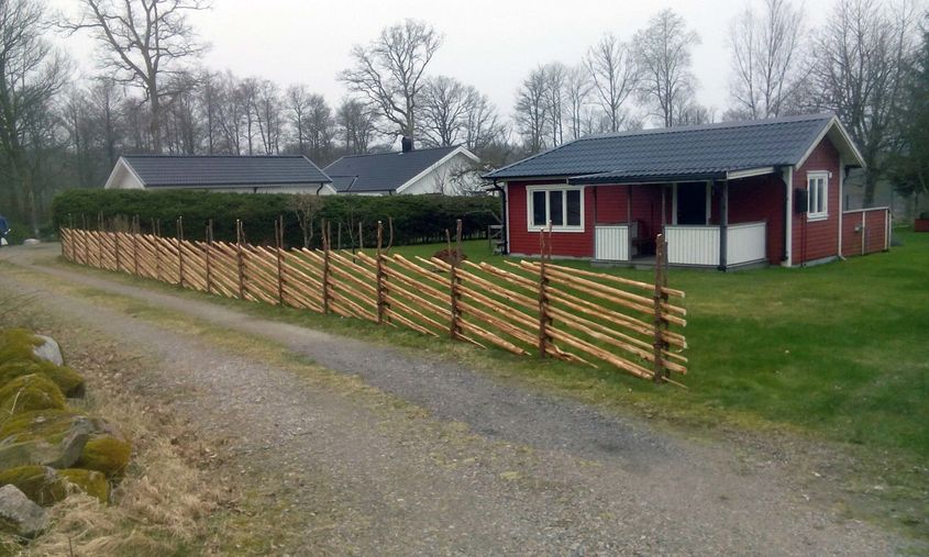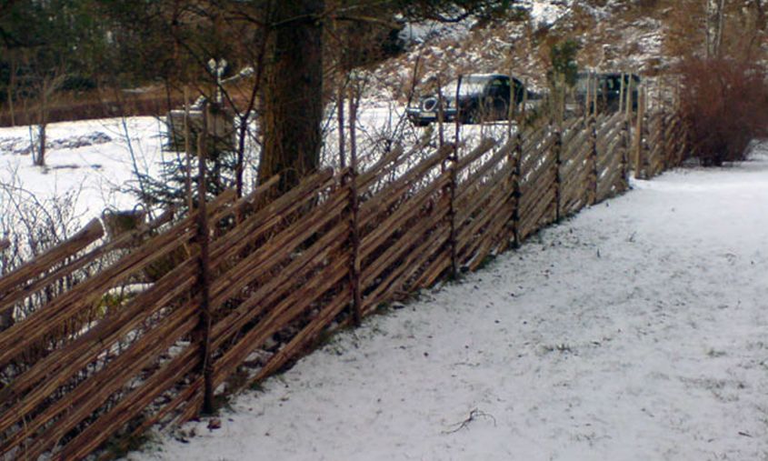Vi bygger dubbla smålandsstaket med obarkade eller handbarkade granslanor. Staketet byggs med 2 slanor mellan varje vidja, en metod som ger ett mycket gediget intryck.